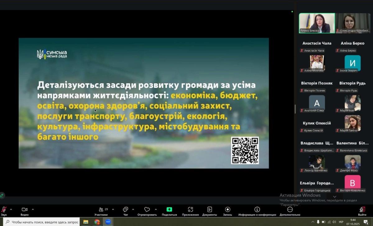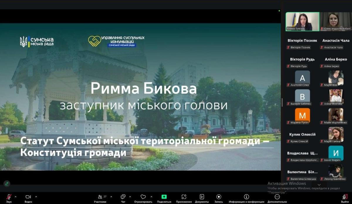 Допомагала їм у цьому заступник міського голови Римма БИКОВА під час бінарного заняття «Статут Сумської міської територіальної громади – Конституція громади».