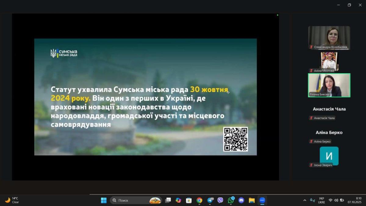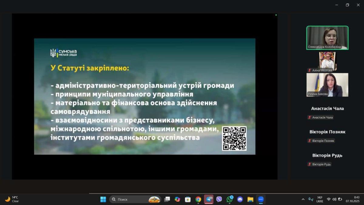 Заступник міського голови розповіла про історію розроблення й ухвалення нового Статуту Сумської громади. Вона наголосила, що документ один з перших в Україні серед інших громад у комплексі враховує сучасні законодавчі підходи до народовладдя, громадської участі, цифрового врядування та безпеки громади.